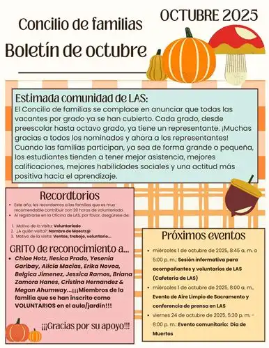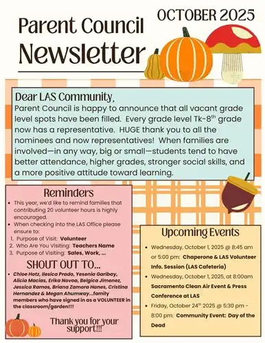 The Mission of the LAS Parent Council is to support student achievement by encouraging parent participation, assisting in the implementation of school programs and activities, and fostering the spirit of the community. / La misión del Concilio de Padres de LAS es apoyar el logro del estudiante al promover la participación de padres, contribuir a la ejecución de los programas y actividades de la escuela, y fomentar el espíritu de comunidad.